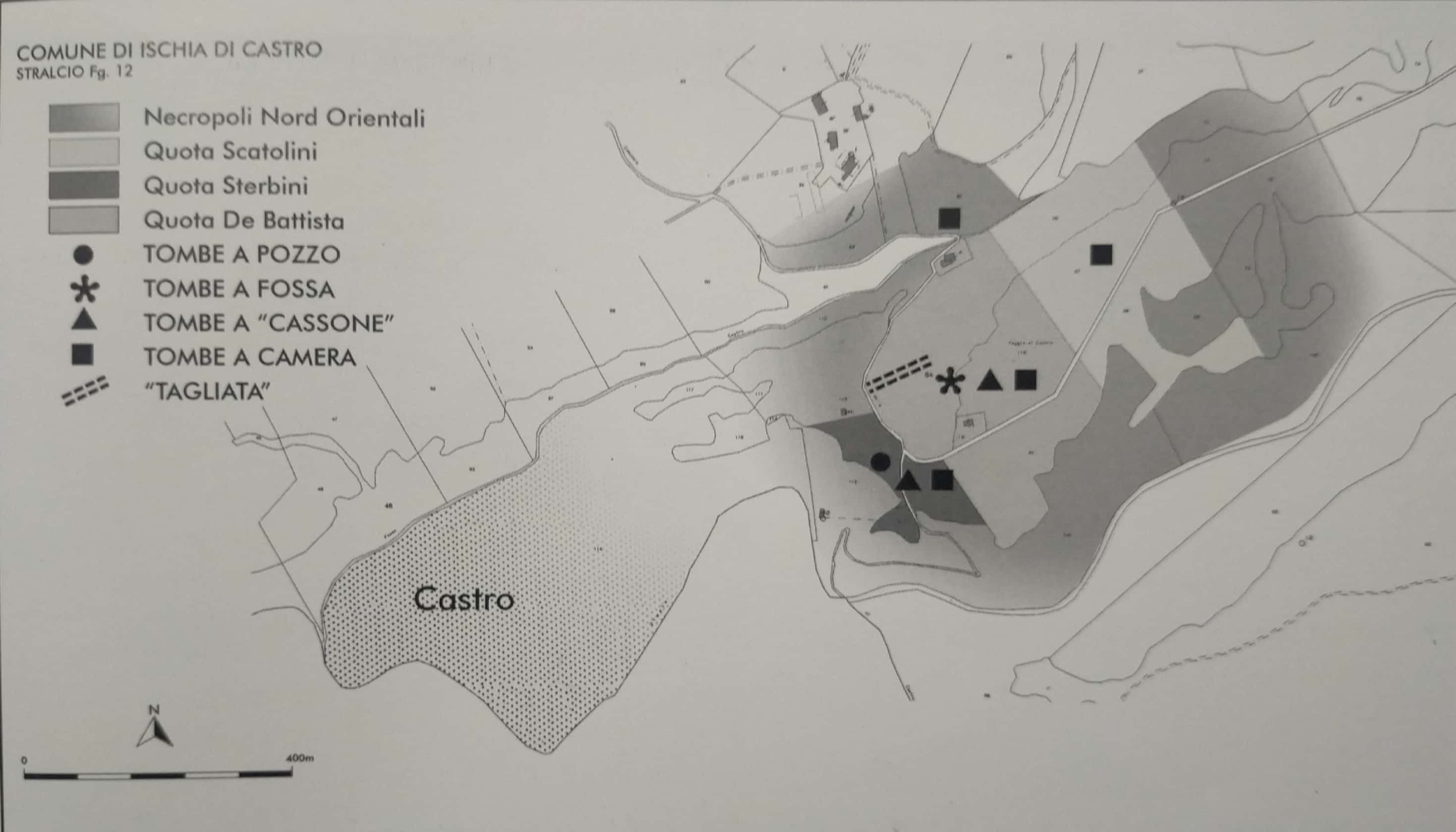 Il rinvenimento di alcune sepolture ad incinerazione nei dintorni di Castro sembra permettere di riconoscere una prima frequentazione dell’area nella prima età del ferro, a cui seguono molto più frequenti tombe a fossa d’età orientalizzante, che denotano un maggior utilizzo della zona. Quest’ultime possono essere suddivise in due categorie: sepolture in semplici fosse terragne e sepolture a fossa profonda, tipologia di chiara derivazione vulcente. Localmente detta “a cassone”, la sepoltura a fossa profonda è caratterizzata da pianta rettangolare e pareti rastremate verso l’alto, a Castro utilizzate dagli inizi del VII agli inizi del VI secolo a.C. per essere poi affiancate intorno alla fine del VII sec. a.C. dalle tombe a camera con vestibolo a cielo aperto, anch’essa di peculiare tipologia vulcente.
