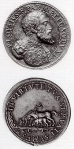 Evidente è la mano fine di Alessandro Cesati, vista la bellezza della rappresentazione del rovescio, il quale fu ripreso ed ampliato da G. F. Bonzagna per le medaglie di Pierluigi e Paolo III, a ricordare la protezione dei Farnese sui Ducati di Parma e Piacenza, ben più chiara nelle medaglie, in cui figurano anche il toro e la lupa, animali simbolo delle città protette dall’Unicorno.